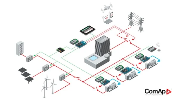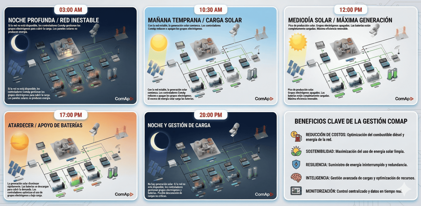 Los controladores ComAp monitorean continuamente todas las fuentes de energía — solar, eólica, diesel — y ajustan automáticamente la salida de cada una para maximizar el uso de renovables sin comprometer la estabilidad. Así opera tu sistema a lo largo de un día típico: